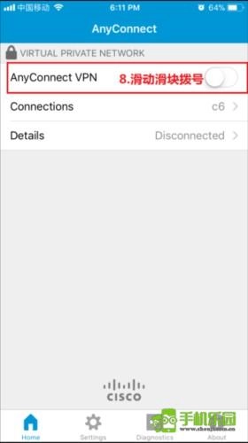 回到主页面后,滑动Anyconnect对应的滑块,就能完成拨号连接操作。