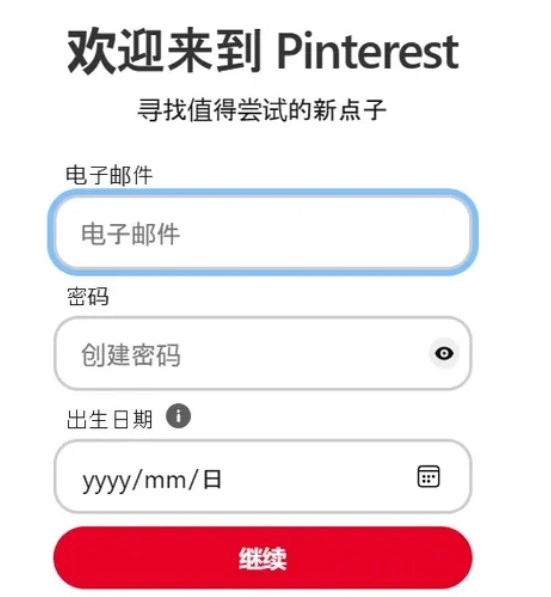 打开Pinterest国际版,输入电子邮箱,接着点击继续按钮