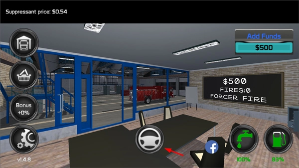 打开消防车模拟游戏,进入主界面后查看消防车的油量、水量等相关信息。
