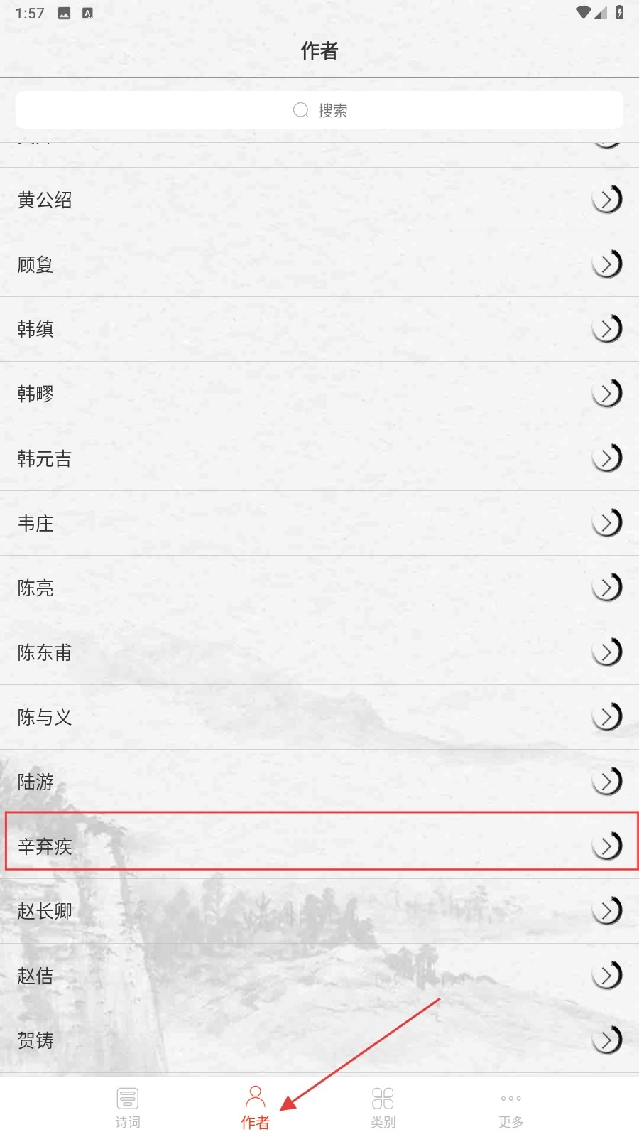 点击页面底部的【作者】选项,进入作者列表页面后,即可查看相应作者的诗词作品。