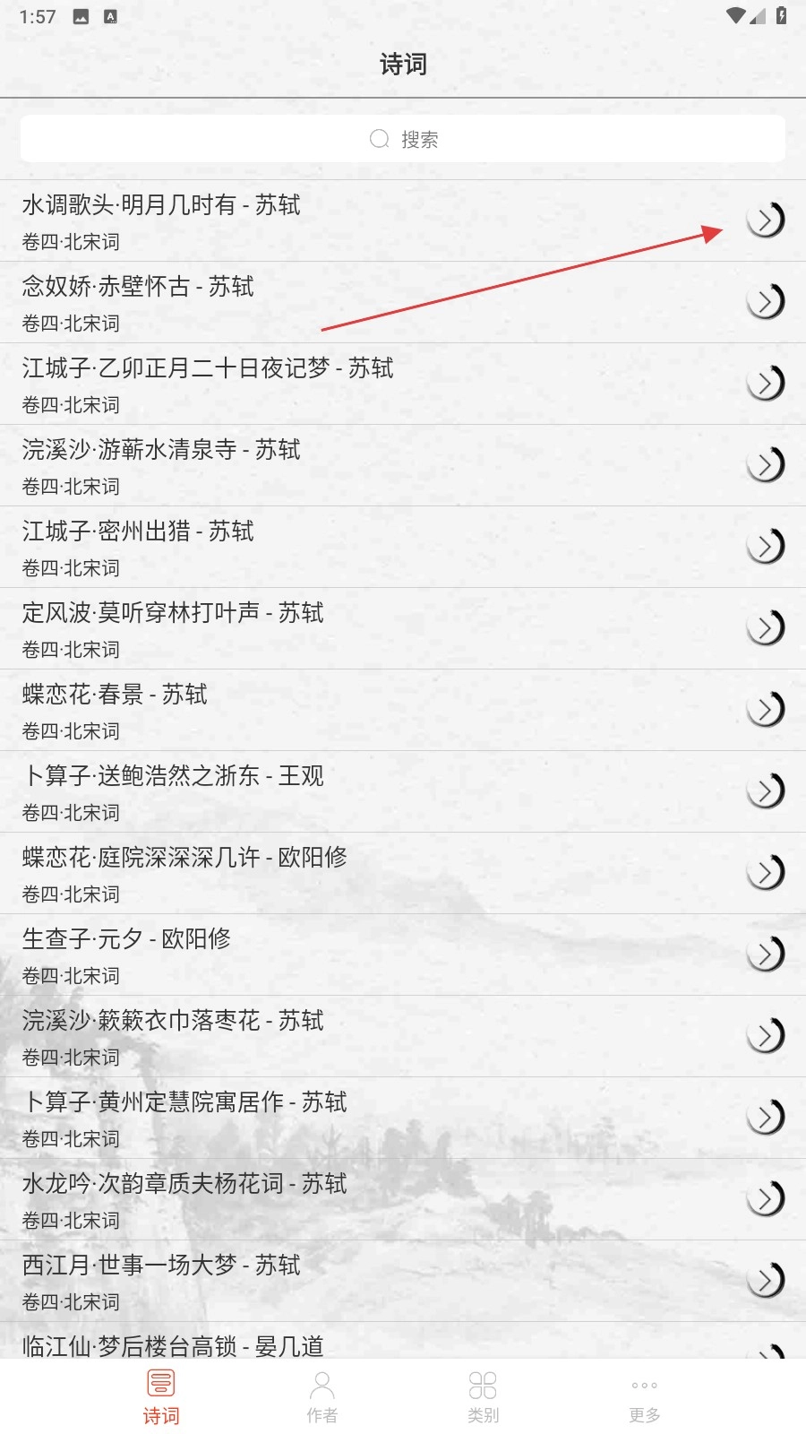 在“诗词”列表页面,点击诗词右侧的按钮,即可进入详情页查看具体内容。
