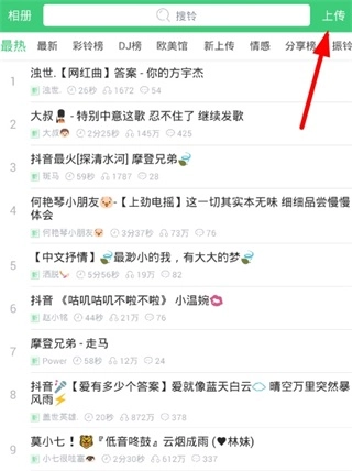 首先在界面上找到并打开铃声多多应用,接着点击首页右上角的上传按钮。