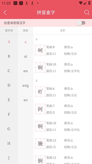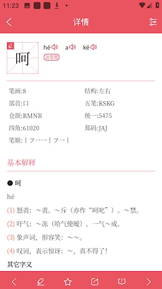 掌上汉语字典可对三万多个汉字进行详细查询,每个汉字条目都涵盖拼音、部首、笔画、笔顺、结构等基础属性,还包含五笔、仓颉等输入编码相关内容。