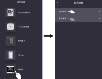 在弹出的设备列表里找到并选择“线控器”,随后进入配网环节,这里能选择NFC(仅安卓设备适用)配网方式或者蓝牙配网方式。