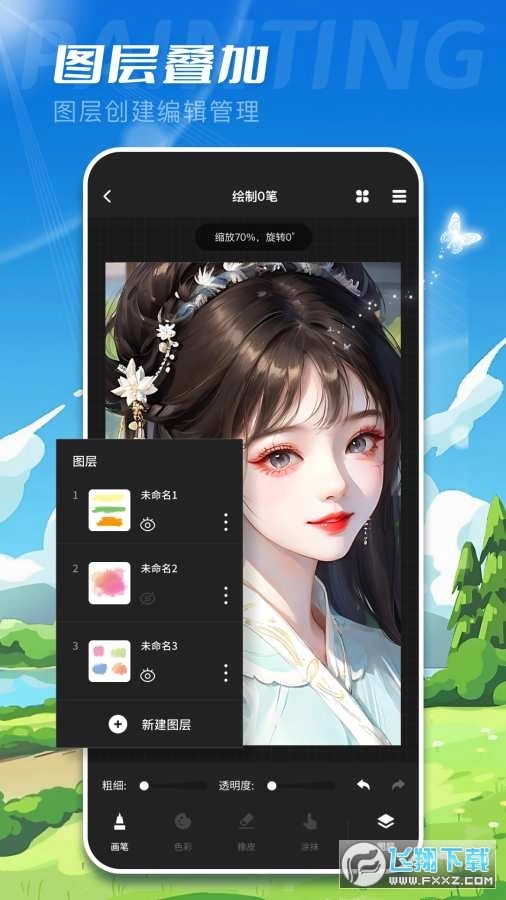 画笔笔触,支持选择区域,油漆桶填充功能,图层复制,嵌套图层,图层移动、旋转与缩放。