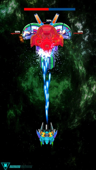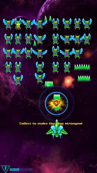 它达成了一项沉浸式的任务,呈现出一个精美的关卡。在入侵者一波波的攻势中向前推进,躲避袭来的火箭,并收集能量道具来增强你的飞船火力。