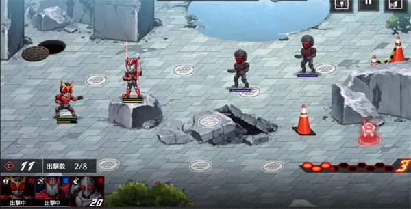 常规战斗关卡玩法如下:玩家要在标有紫色路线的敌人进攻路径上放置假面骑士,借助不同骑士的技能特点来拦截并击败敌人。部署每个骑士都需要消耗点数,而技能点数会随时间逐渐积累,积累足够后就能释放必杀技。关卡的核心目标是歼灭所有敌人,敌方的剩余数量会显示在屏幕的上方位置。