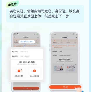 进行实名认证时,请务必如实填写姓名与身份证号,并上传身份证正反面照片,完成后点击“下一步”按钮即可。