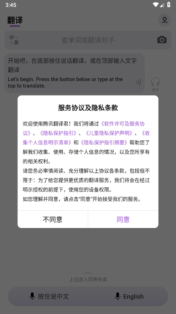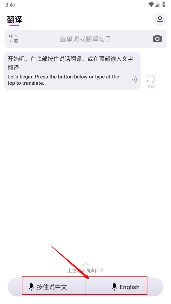 进入主页,点击"按住说中文"即可进行语音翻译。