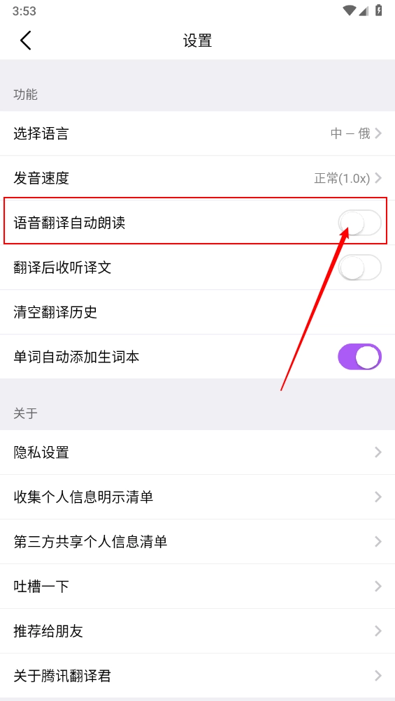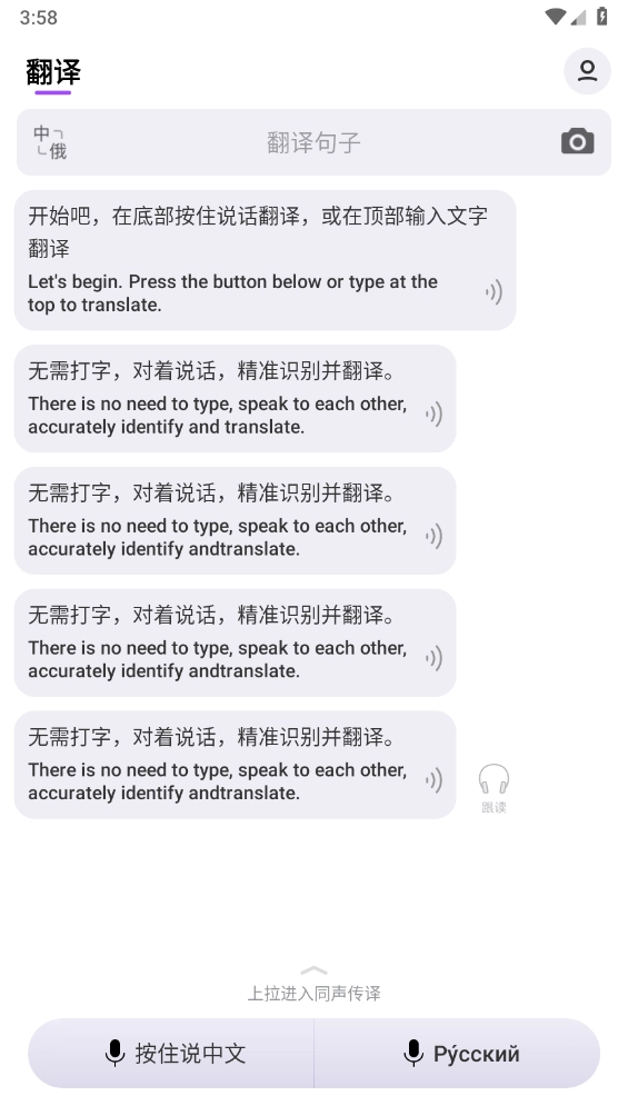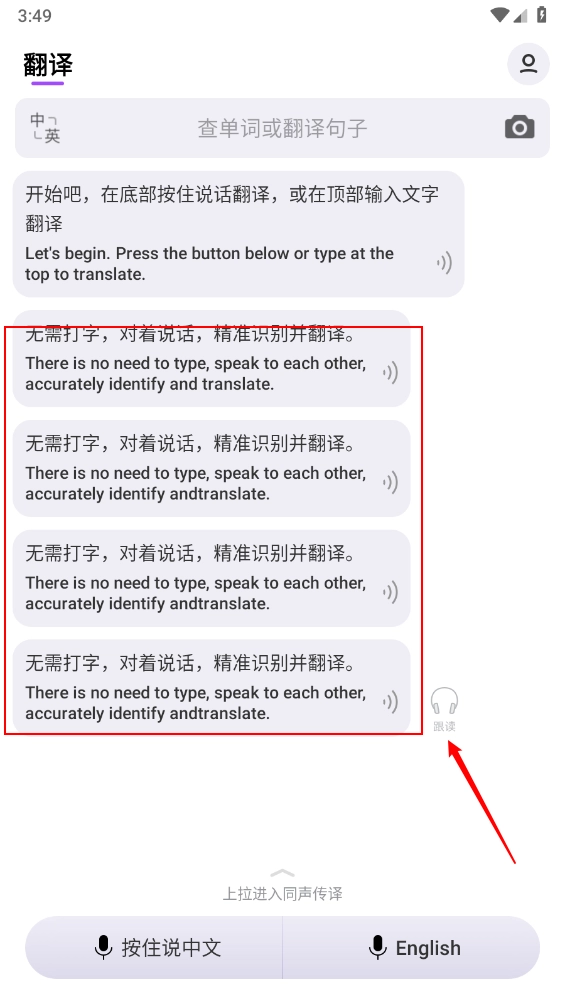 完成翻译后即可查看翻译的句子,支持点击"跟读"。