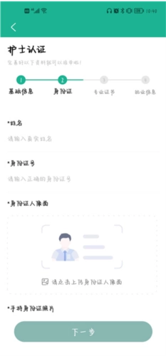 填写姓名、身份证号等基础信息,上传身份证及手持身份证的照片后,点击“下一步”按钮。