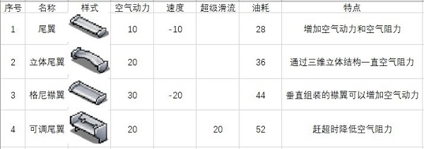 大尾翼:能显著提升下压力与空气阻力,需将尾翼升级到80%方可解锁。其一级属性为速度降低40,过弯性能提升40。网上不少玩家认为尾翼的实际作用并不明显,因此选择不进行研究。不过小编注意到,比赛中的很多地图地形较为复杂,过弯时若操作不当,就容易撞到墙壁,或者因速度下降而被其他选手超越。