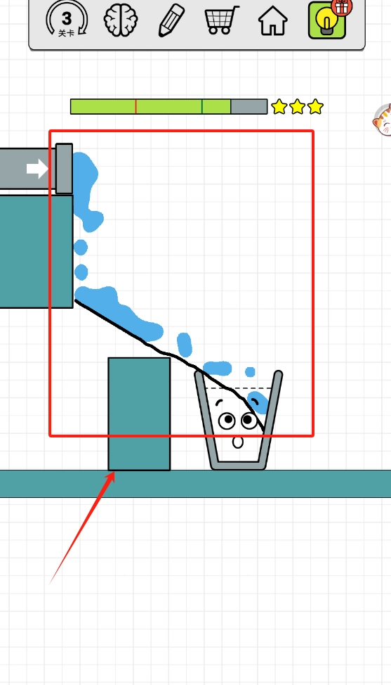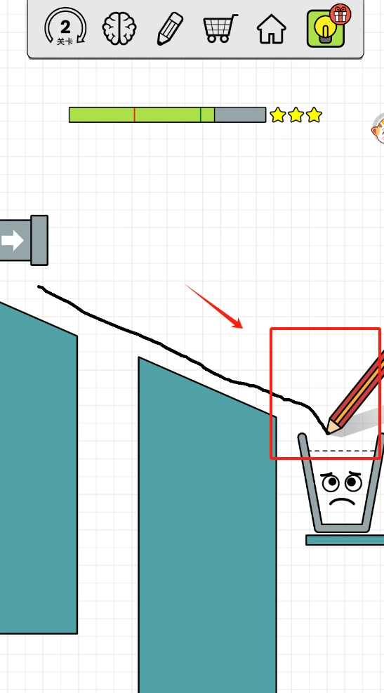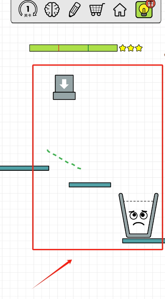 点击红框里的画笔图标,在阶梯上画线引导水流,让水准确流进带有表情的容器。