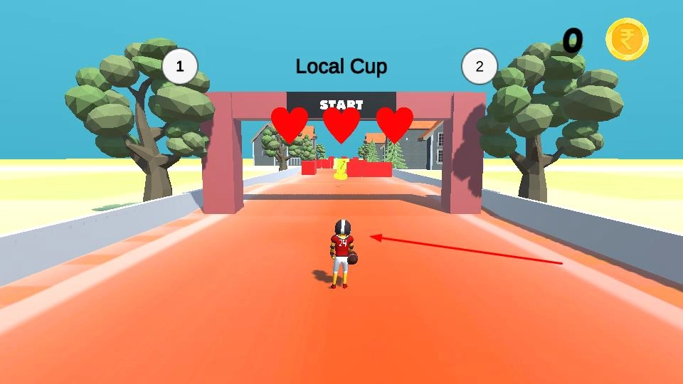在赛道上奔跑时,注意避开红色方块障碍物,尽可能收集黄色金币;同时留意上方的Local Cup进度条以及1、2关卡的标识,以此查看当前关卡的进程。