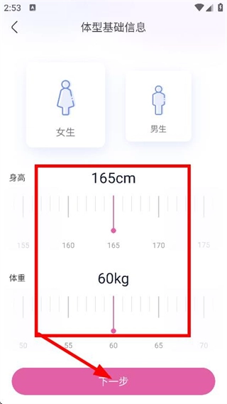 在体型基础信息填写页面,选定性别、设定身高与体重后,点击“下一步”按钮,即可继续推进体型检测流程。