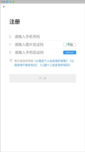 在“注册”页面,依次填写申请人的电话号码,输入图片验证码和手机验证码,随后点击“下一步”按钮。