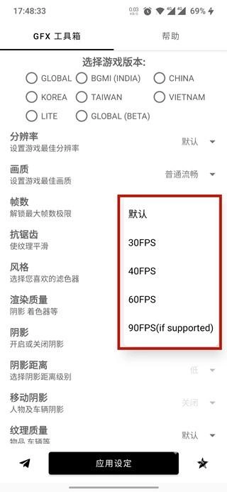 另外,在gfx工具箱里还能对诸如抗锯齿、阴影、纹理等多项数据进行设置修改,完成所有设置后,只需点击底部的“应用设定”按钮,就能开启体验啦!