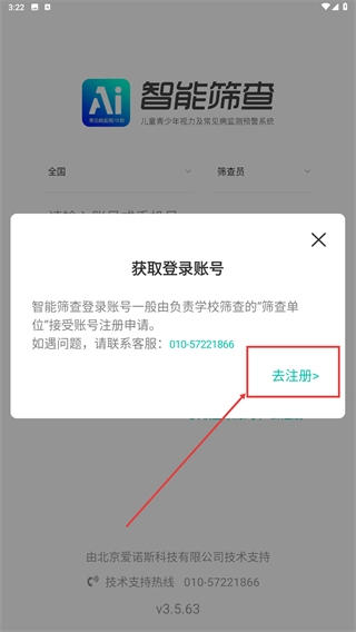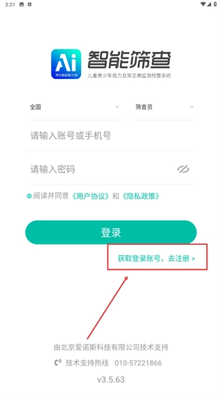 在智能筛查的启动页面,点击【同意】按钮,确认同意用户协议和隐私政策后,即可进入登录界面。