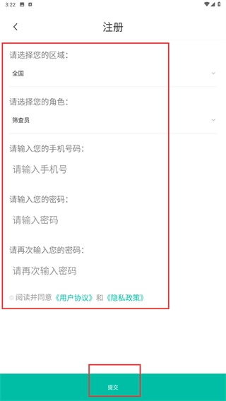 在注册页面,先挑选所属区域和对应角色,接着输入手机号码、设置密码等必要信息,再勾选相关协议,最后点击【提交】按钮,即可完成账号注册流程。
