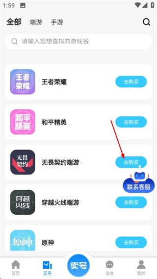 在购买列表页面选定想要的游戏,点击“去购买”按钮,即可进入相应的账号列表页面。