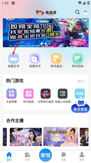 在进入地瓜阁首页后,点击“我要买号”选项,即可跳转至游戏账号购买列表页面。