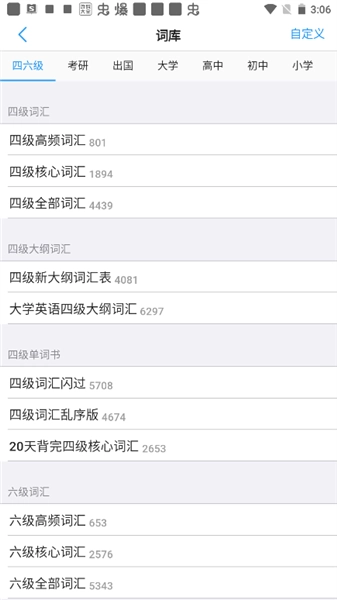 词库资源丰富多样,覆盖小学、中考、高考、大学四级、六级、考研及雅思、托福等不同学习阶段与考试场景,用户能够依据自身实际需求灵活挑选适配的词库。