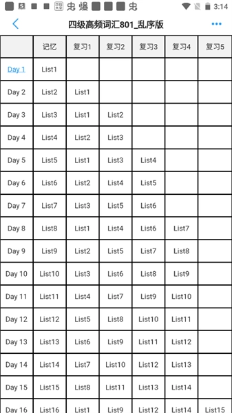 答:每天的学习都包含“记忆”和“复习”两个环节,Day2需要完成List2的记忆任务与List1的复习任务,当这两项都完成打卡后,页面顶部的向右箭头就会变成可点击状态,点击后就能切换到Day3的学习内容。