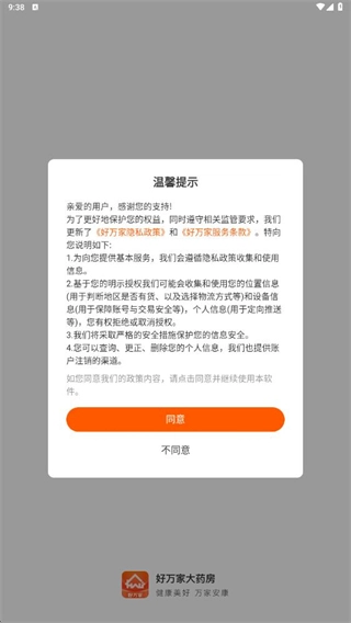 先打开好万家大药房的手机应用,点击同意相关协议后注册一个账户。