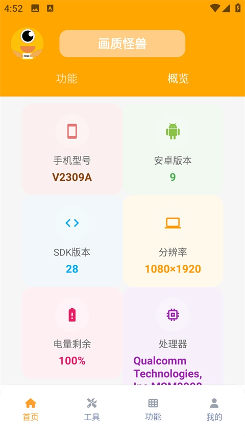 进入软件首页后,能查看用户设备的各类信息,页面下方设有开启高画质的选项。