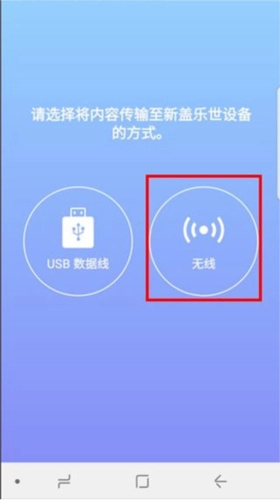 接下来选择把内容传输到新手机的方式,这里就以选择【无线】为例(需要说明的是:旧设备上同样要选择【无线】方式)。