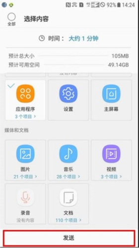 在旧设备上挑选好需要传输的内容,把想传输的文件勾选上,然后点击【发送】按钮。