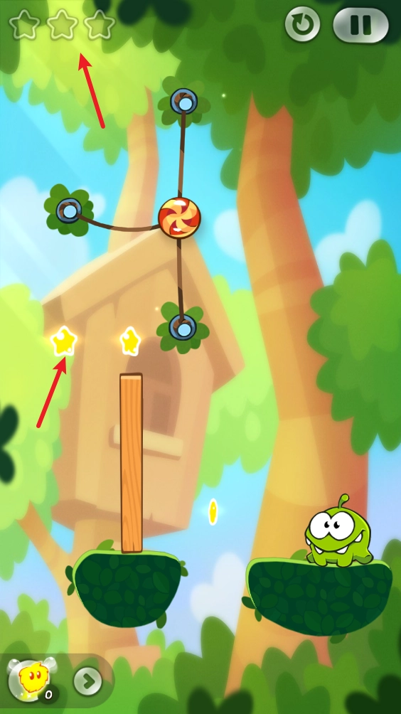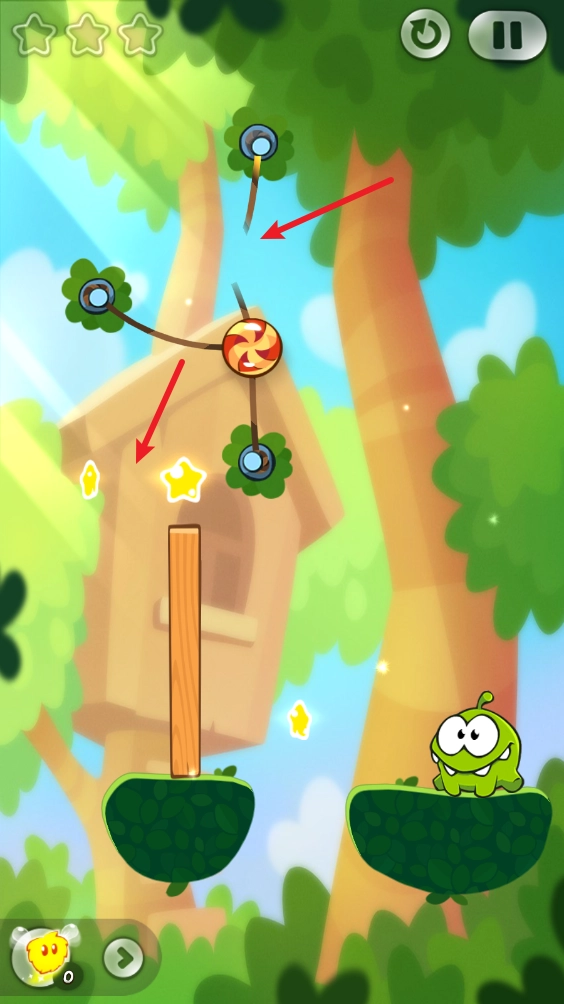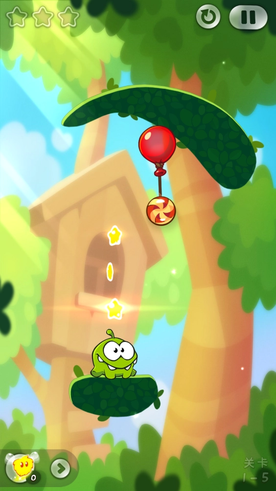 就拿这一关来说,我们先把最上面的绳子割断,糖果就会往左边移动,从而撞到两颗星星。