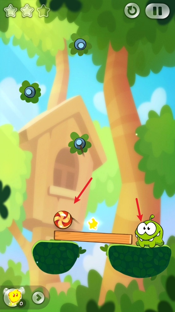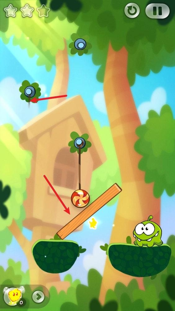 之后我们把左上角的绳子剪断,如此一来糖果就会借着惯性把木板撞倒。