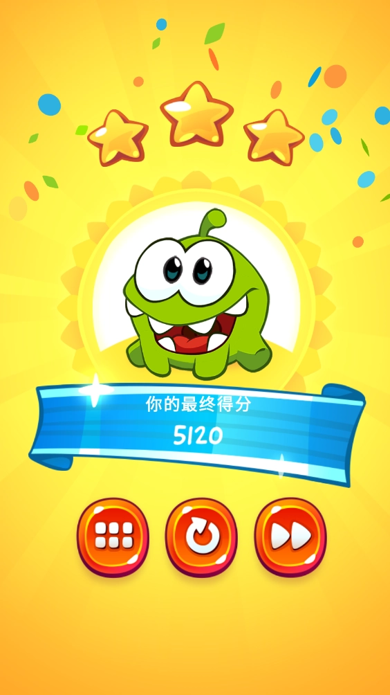最后找准时机切断最后那根绳子,让糖果能顺着木板滚落下来,收集星星后,再掉进小怪物的嘴里。