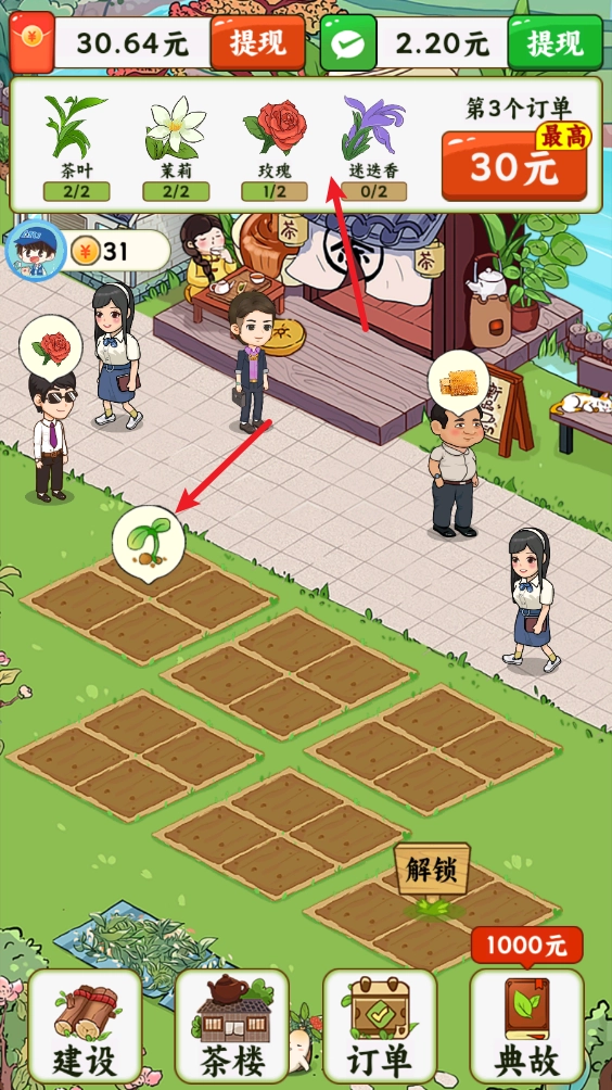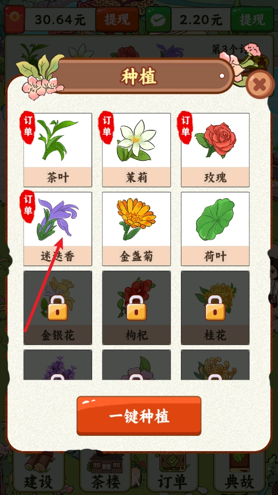 进入游戏后,我们可以通过上方的订单详情查看到当前所缺的植物,点击空地进行种植。