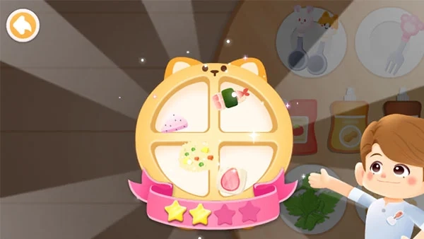功能:支持幼儿自主搭配健康餐食,系统会依据营养学标准对搭配结果给出星级评定。