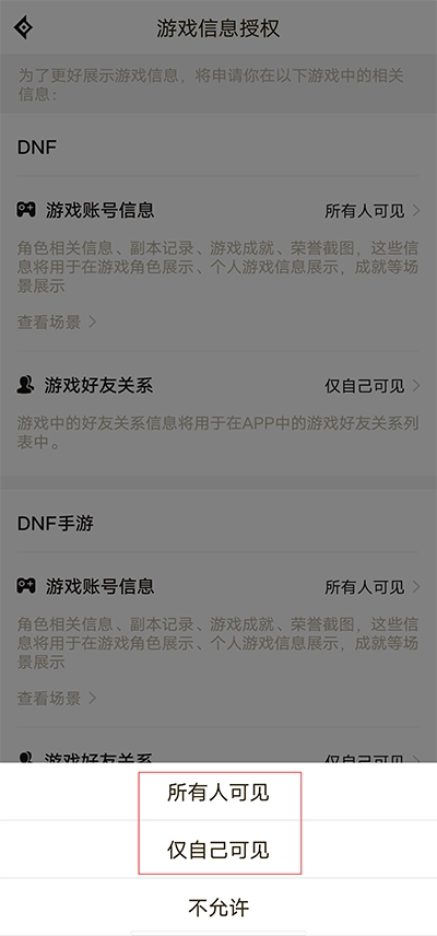 在弹出的页面里,点击游戏账号信息右侧的“所有人可见”选项。