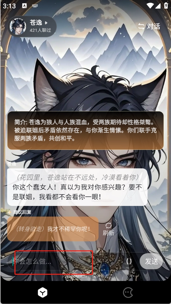 挑选好虚拟人物后,在输入框里填写对话内容,再点击“发送”按钮。