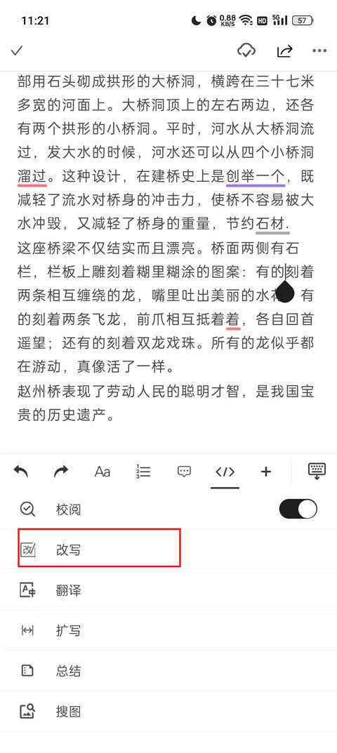 选中目标文字后,会弹出一个操作框,点击“改”字按钮,系统将自动对该段落进行改写。