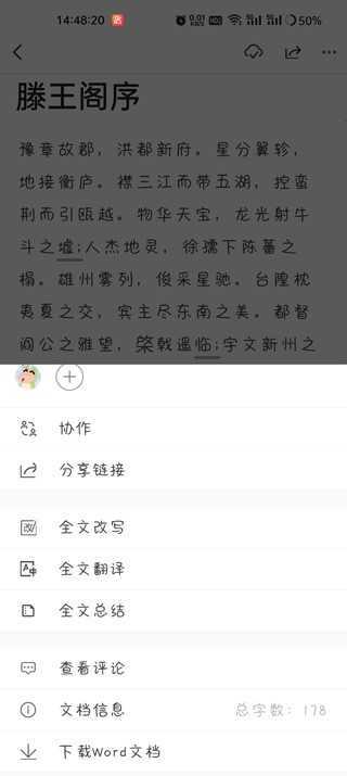 通过右上角的菜单按钮,可以访问全文改写、翻译及总结等功能。