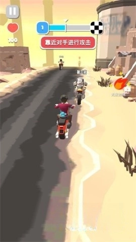 只需轻轻向前滑动,摩托车就能飙到更快的速度。当与对手距离拉近时,玩家还能抓住机会发起攻击,将敌手击败。