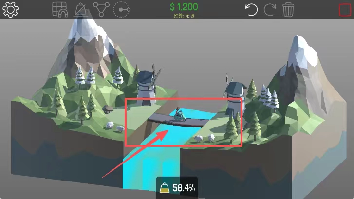 查看桥梁的成品图,留意蓝色桥梁的样式以及58.4%的进度情况,同时欣赏山地风车构成的景观和游戏的进度状态。