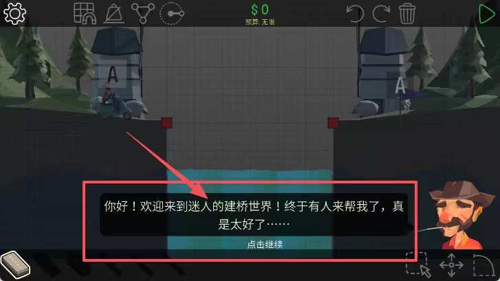 打开游戏后,点击蓝色的继续按钮,即可开启建桥游戏,游戏背景呈现出森林与桥梁的场景。