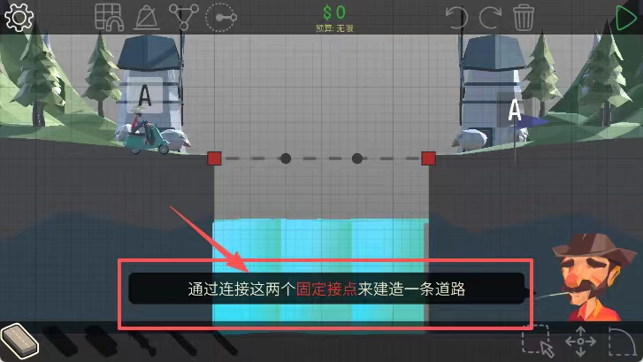 看建桥设计页面,使用工具把两个A接点连接起来,按照提示修筑道路,底部设有操作提示框。