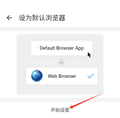 在设置页面里打开“设为默认浏览器”的选项,接着进入设置流程并点击“开始设置”按钮。