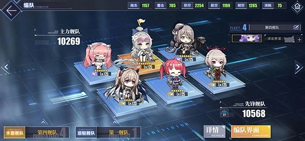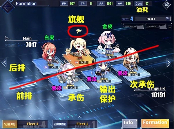 3个前排加3个后排能组成一支满编的出击小队,小队可以不满编,但必须保证至少有1个前排和1个旗舰;一旦旗舰或前排全部被消灭,就会导致战斗失败。旗舰所在的位置享有经验加成。通过按住并拖动的方式,可以横向调整成员的位置,但不能在前后排之间进行拖动操作。