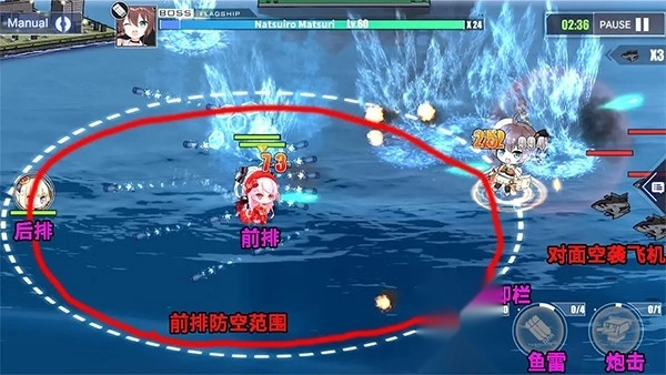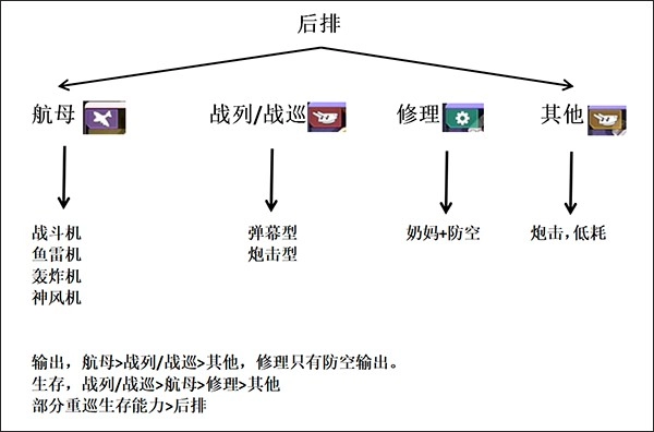 后排是队伍的核心输出点,同时也能承担清理前排漏过的自爆船的任务;此外还可以选择专职修理舰或者具备治疗能力的舰船来维持队伍血量。后排受到伤害主要来自自爆船和敌方空袭,所以在防空压力较大的关卡中,应当优先提升防空能力而非单纯堆叠输出。