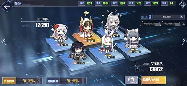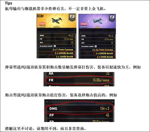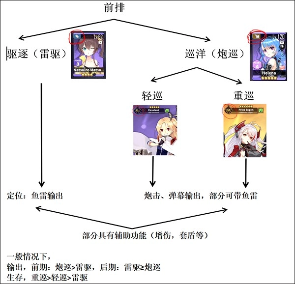 前排舰船的炮击频率取决于主副炮的射速属性,防空圈的覆盖范围由高射炮的射程决定。驱逐舰释放鱼雷需要等待技能冷却完毕,在前期装备配置不佳时,其输出能力比不上炮巡洋舰,并且驱逐舰自身生存能力较弱,因此前期建议优先以炮巡洋舰作为主要培养对象。