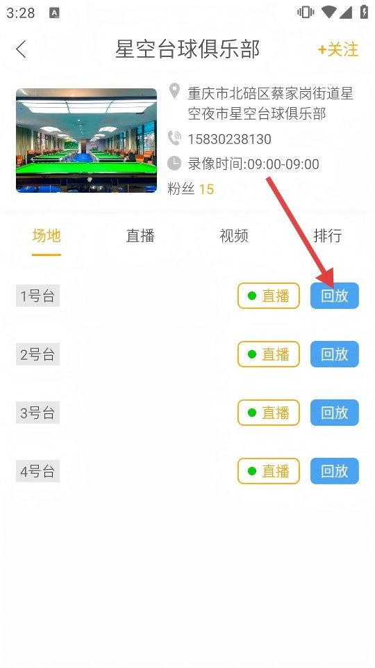 在1号台的场馆详情页点击【回放】按钮,即可进入录像回放界面,观看过往的台球视频。