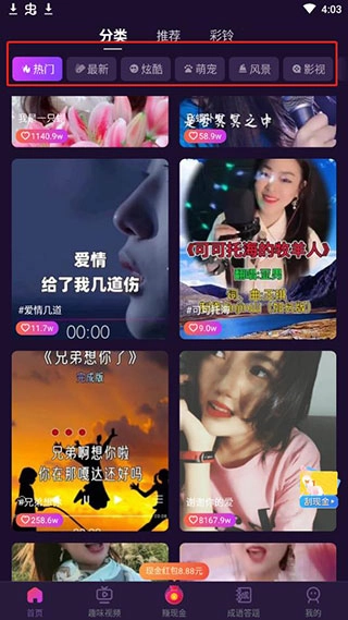 进入首页后,你会看到平台为用户准备了丰富多样的来电秀视频;在分类板块中,系统提供了多种不同类别的内容,用户可以依据个人喜好来挑选合适的来电秀视频。